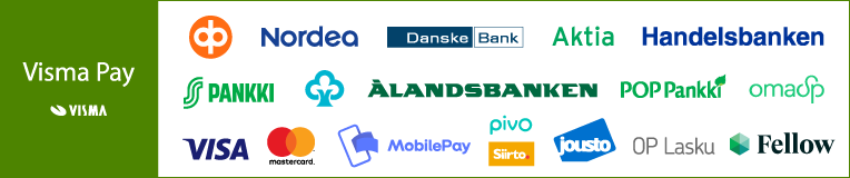 Verkkokaupan maksuvälittäjänä toimii Visma Pay (Visma Payments Oy, y-tunnus 2486559-4), joka on rekisteröity Finanssivalvonnan ylläpitämään maksulaitosrekisteriin. Maksamiseen siirrytään Visma Payn verkkopalvelun kautta ja tiliotteella ja laskulla maksun saajana näkyy Visma Pay tai Visma Payments Oy. Visma Pay välittää maksut verkkokauppiaalle. Maksaminen on turvallista, sillä kaikki maksutapahtumaa koskevat tiedot välitetään salattua yhteyttä käyttäen niin ettei kukaan ulkopuolinen taho näe maksutapahtuman tietoja.